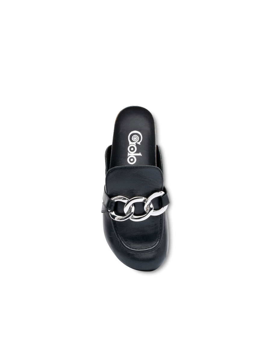 A slip-on, ultra-comfortable mule with chain link detailing. All genuine leather materials made on the Golo ShoeSpa comfort system featuring plush footbed padding and gel arch support, you can wear these and look great all day long.